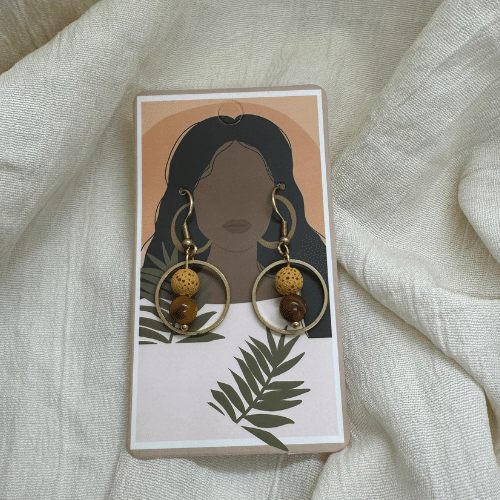 Unsere Diffuser Ohrringe verbinden Stil und Funktion auf einzigartige Weise. Der Lavastein, ist ein natürlicher Diffuser, der einige Tropfen deines liebsten ätherischen Öls aufnimmt und seinen sanften Duft den ganzen Tag verteilt. Kombiniert mit einem Messing-Kreis-Anhänger und einer Mookait Perle, vereinen diese Ohrringe sowohl mystische Eleganz als auch funktionale Duftentfaltung.