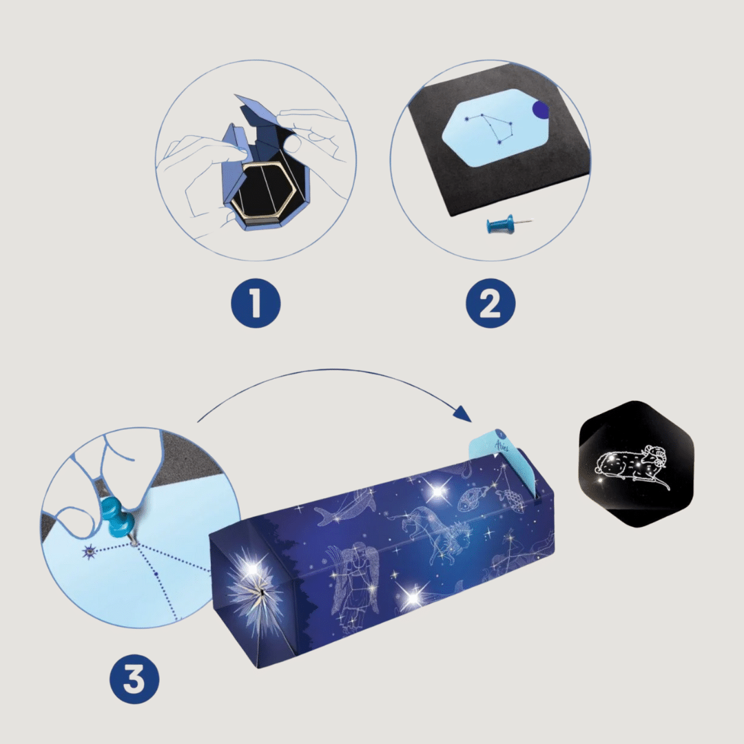Mit diesem einzigartigen Kreativset können Kinder ihren eigenen Sternen-Projektor basteln und die Magie des Nachthimmels hautnah erleben. Sie stecken kleine Sterne in die vorgegebenen Karten, um die Sternbilder nachzubilden – darunter die 12 Tierkreiszeichen und faszinierende Tierbilder. Anschließend betrachten sie die Karten durch den selbst zusammengebauten Projektor und sehen die Sternbilder leuchten wie am echten Himmel! Eine spannende 2-in-1-Aktivität, die sowohl das handwerkliche Geschick als auch das Interesse an Astronomie fördert.