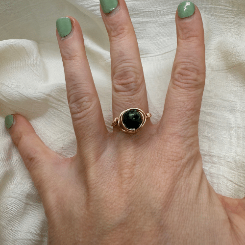 Dieser außergewöhnliche Drahtring mit einer Kambaba Jasper Perle ist das perfekte Beispiel für kunstvolle Handwerkskunst. Jeder Ring wird mit viel Liebe und Hingabe von Hand gefertigt, was ihn zu einem einzigartigen Unikat macht. Der Ring aus hochwertigem 18k vergoldetem Kupferdraht ist nicht nur langlebig, sondern behält auch seine Schönheit – ohne sich zu verfärben – auch bei täglichem Tragen.
