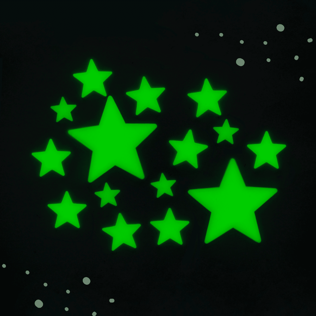 Tagsüber laden sich die Sterne durch Tageslicht oder Raumbeleuchtung auf – abends und nachts geben sie ein sanftes, fluoreszierendes Licht ab. Ideal als Einschlafhilfe für Kinder oder zur stimmungsvollen Dekoration von Schlaf- und Jugendzimmern.