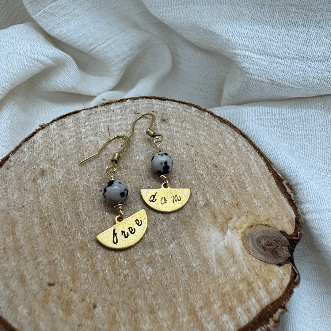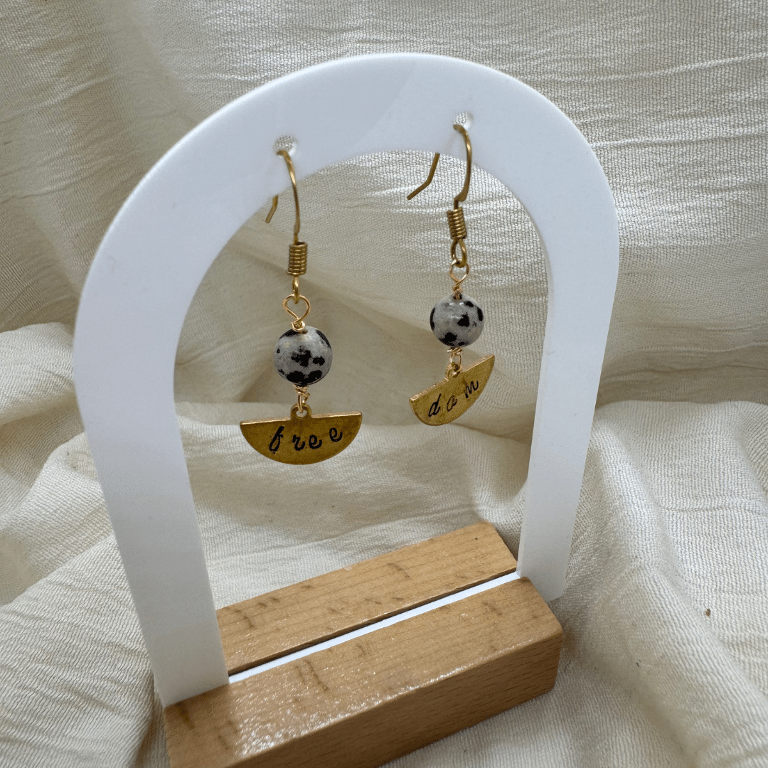 Die Ohrringe sind bewusst schlicht gehalten, damit das Wort im Mittelpunkt steht.